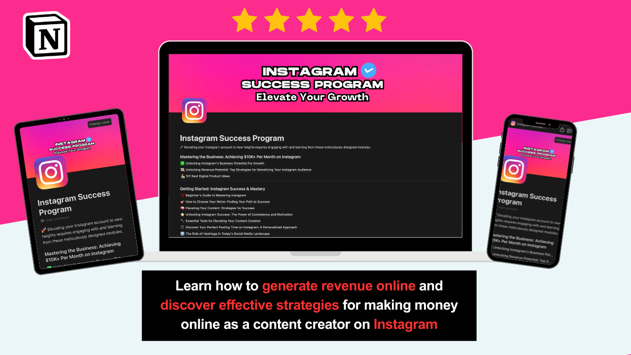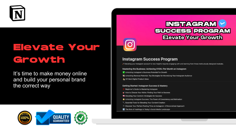 Elevate your Instagram game with the Instagram Success Program, your premier resource for mastering the art of content creation and monetization on Instagram. This elite program is designed for ambitious creators and offers an unparalleled suite of 30 meticulously crafted professional modules of knowledge within Notion, ensuring you stand out in the competitive Instagram landscape.